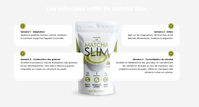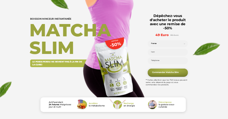 Matcha Slim est un complément dont le rôle est de vous aider à perdre du poids corporel en excès. Cette boisson devrait accélérer votre métabolisme, permettant ainsi une combustion efficace des graisses dans des zones telles que l'abdomen, les jambes, les fesses, les bras, le dos et d'autres zones où les gens ont tendance à accumuler plus de graisse.